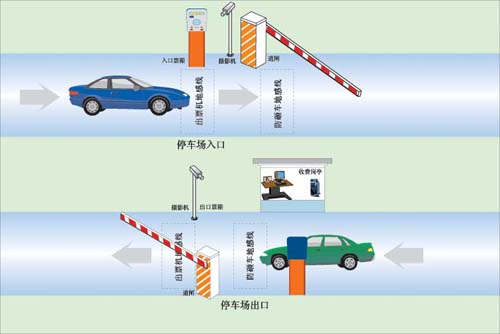 出口部分主要由非接觸感應(yīng)式ID卡讀卡器、地感、掃描平臺,收卡機,出口道閘機、出口攝像機,收卡機等組成。