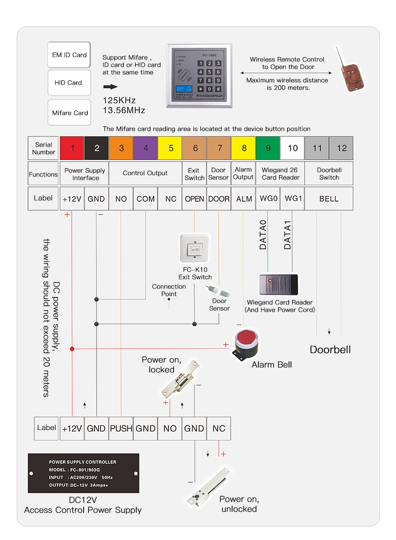 Hello, thank you for purchasing our company's FC-198E keyboard access controller, you can refer to the following pictures to connect: