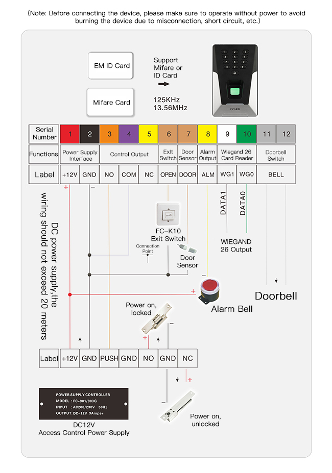 Hello, thank you for purchasing our company's fingerprint access controller, you can refer to the following pictures to connect: